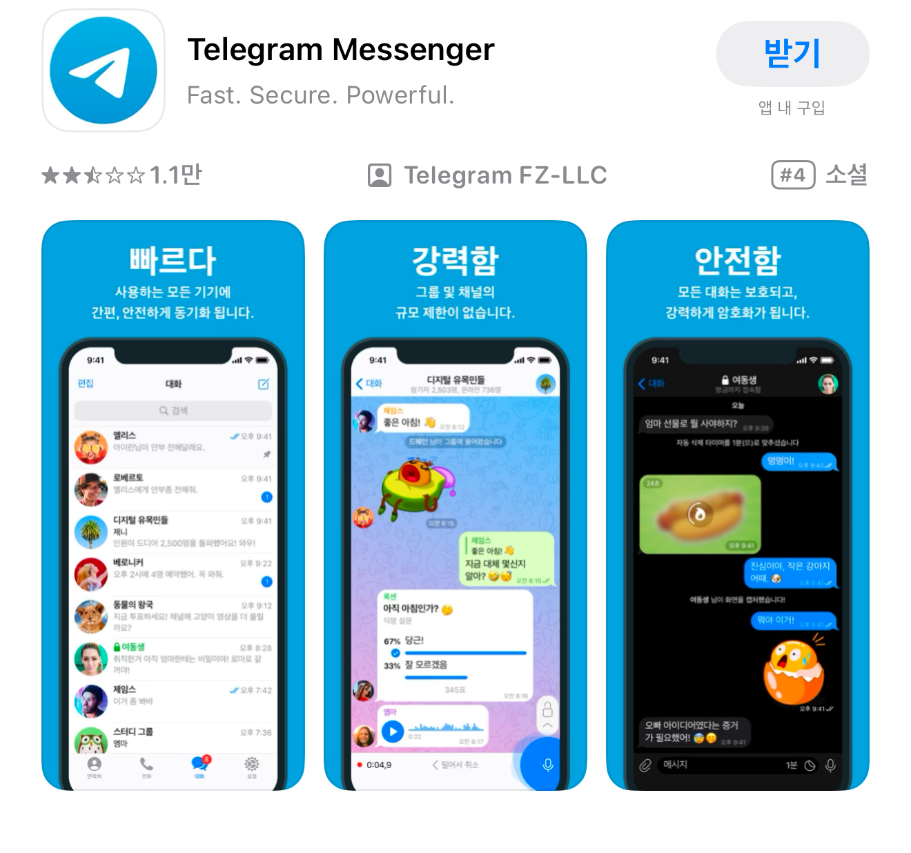 텔레그램은 속도와 보안을 중점으로 한 메시징 앱으로, 매우 빠르고 간단하며 무료입니다. 텔레그램은 동시에 모든 기기에서 사용할 수 있으며, 메시지는 여러 휴대폰, 태블릿 또는 컴퓨터 간에 끊김 없이 동기화됩니다. 텔레그램은 전 세계에서 가장 많이 다운로드된 5개의 앱 중 하나이며, 9억 5천만 명 이상의 활성 사용자를 보유하고 있습니다.